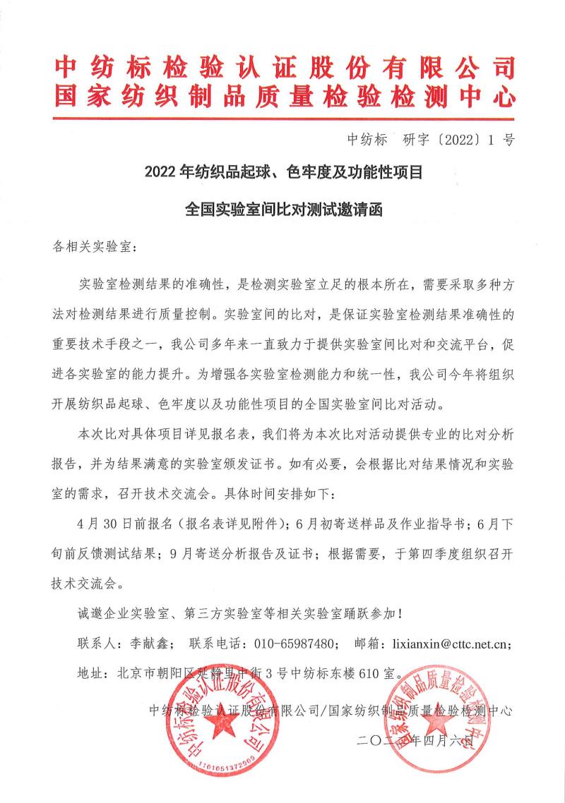 邀請(qǐng)函:2022年度紡織品起球、色牢度以及功能性項(xiàng)目的全國(guó)實(shí)驗(yàn)室間比對(duì)活動(dòng)邀請(qǐng)函