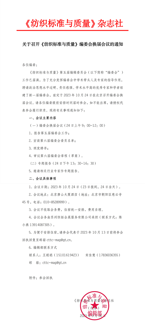 《紡織標(biāo)準(zhǔn)與質(zhì)量》第五屆編輯委員會(huì)(以下簡(jiǎn)稱(chēng)“編委會(huì)”)工作已屆滿,為了充分發(fā)揮編委會(huì)中學(xué)術(shù)帶頭人及專(zhuān)家的指導(dǎo)作用,聘請(qǐng)政治思想水平過(guò)硬、責(zé)任感強(qiáng)、學(xué)術(shù)水平高的優(yōu)秀專(zhuān)家和學(xué)者組建了新一屆編委會(huì),茲定于2023年10月24日在北京召開(kāi)編委會(huì)換屆會(huì)議。各有關(guān)單位有意參會(huì)請(qǐng)按通知報(bào)名,具體參會(huì)事項(xiàng)及參會(huì)回執(zhí)見(jiàn)附件。