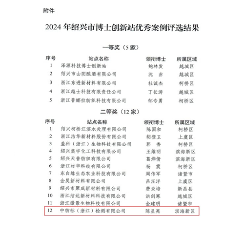 近日,紹興市科學(xué)技術(shù)協(xié)會(huì)公布了2024年紹興市博士創(chuàng)新站優(yōu)秀案例評(píng)選結(jié)果,通用技術(shù)中紡標(biāo)(浙江)檢測(cè)有限公司(以下簡稱“浙江中紡標(biāo)”或“公司”)報(bào)送的“浙江中紡標(biāo)-陳星亮博士創(chuàng)新站案例”被評(píng)選為二等獎(jiǎng)。