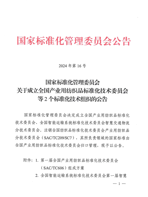 近日,國家標準化管理委員會2024年第16號文發(fā)布公告,決定成立全國產業(yè)用紡織品標準化技術委員會,編號為SAC/TC 606,英文名稱為National Technical Committee 606 on Technical Textiles of Standardization Administration of China,主要負責產業(yè)用紡織品基礎通用、實驗方法、產品性能等領域國家標準制修訂工作。同時注銷全國紡織品標準化技術委員會產業(yè)用紡織品分技術委員會(SAC/TC209/SC7),其所負責領域的國家標準由全國產業(yè)用紡織品標準化技術委員會歸口管理。
