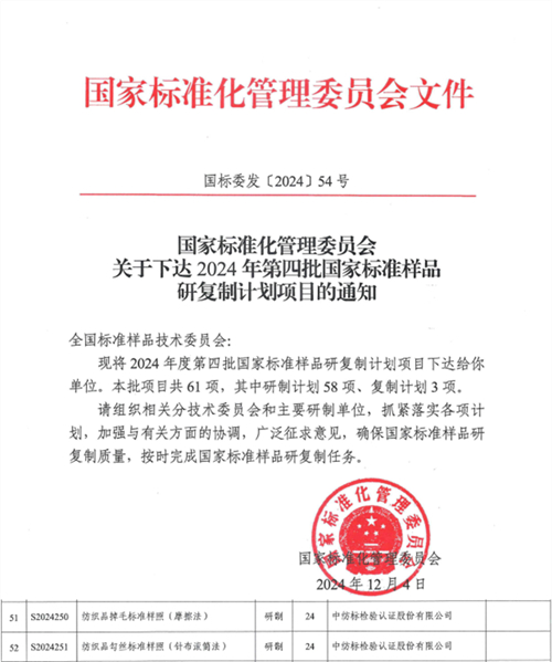 2024年12月4日,國家標準化管理委員會印發(fā)《關于下達2024年第四批國家標準樣品研復制計劃項目的通知》(國標委發(fā)[2024]54號),下達2024年度第四批國家標準樣品研復制計劃項目共61項,正式立項的2項紡織標準樣品計劃均由通用技術中紡院中紡標檢驗認證股份有限公司(以下簡稱“中紡標”)承擔研制。