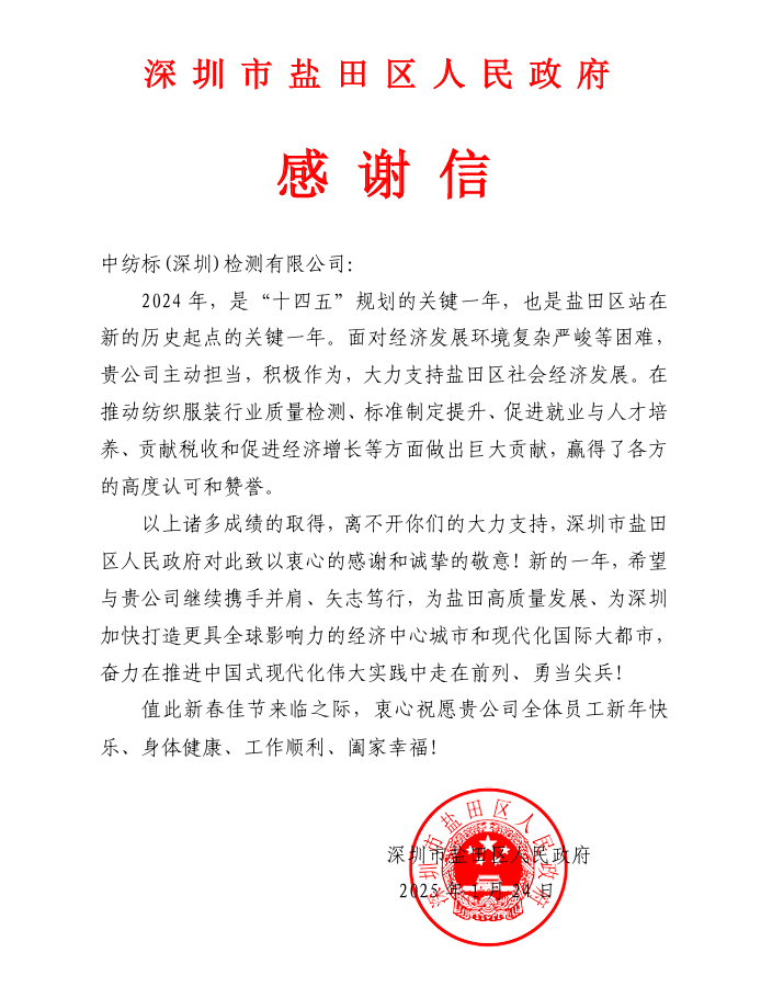 新年伊始,通用技術中紡標(深圳)檢測有限公司(以下簡稱“深圳中紡標”)收到了深圳市鹽田區(qū)人民政府的感謝信,對2024年深圳中紡標在面對經濟發(fā)展環(huán)境復雜嚴峻等困難,主動擔當,積極作為,助力鹽田區(qū)社會經濟發(fā)展,在推動紡織服裝行業(yè)質量檢測、標準制定提升、促進就業(yè)與人才培養(yǎng)、貢獻稅收和促進經濟增長等方面給予了充分肯定和高度評價。