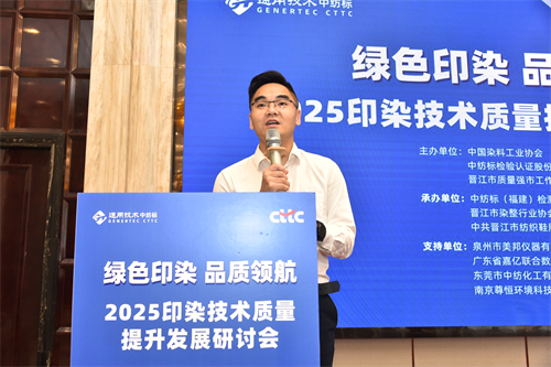 4月24日,由中國(guó)染料工業(yè)協(xié)會(huì)、通用技術(shù)中紡標(biāo)檢驗(yàn)認(rèn)證股份有限公司(以下簡(jiǎn)稱“中紡標(biāo)”)、晉江市質(zhì)量強(qiáng)市工作領(lǐng)導(dǎo)小組辦公室聯(lián)合主辦,中紡標(biāo)(福建)檢測(cè)有限公司(以下簡(jiǎn)稱“福建中紡標(biāo)”)、晉江市染整行業(yè)協(xié)會(huì)、中共晉江市紡織鞋服產(chǎn)業(yè)鏈委員會(huì)聯(lián)合承辦,泉州市美邦儀器有限公司、廣東省嘉億聯(lián)合數(shù)碼科技有限公司、東莞市中紡化工有限公司、南京尊恒環(huán)境科技有限公司支持的“綠色印染 品質(zhì)領(lǐng)航︱ 2025印染技術(shù)質(zhì)量提升發(fā)展研討會(huì)”在晉江成功舉辦。